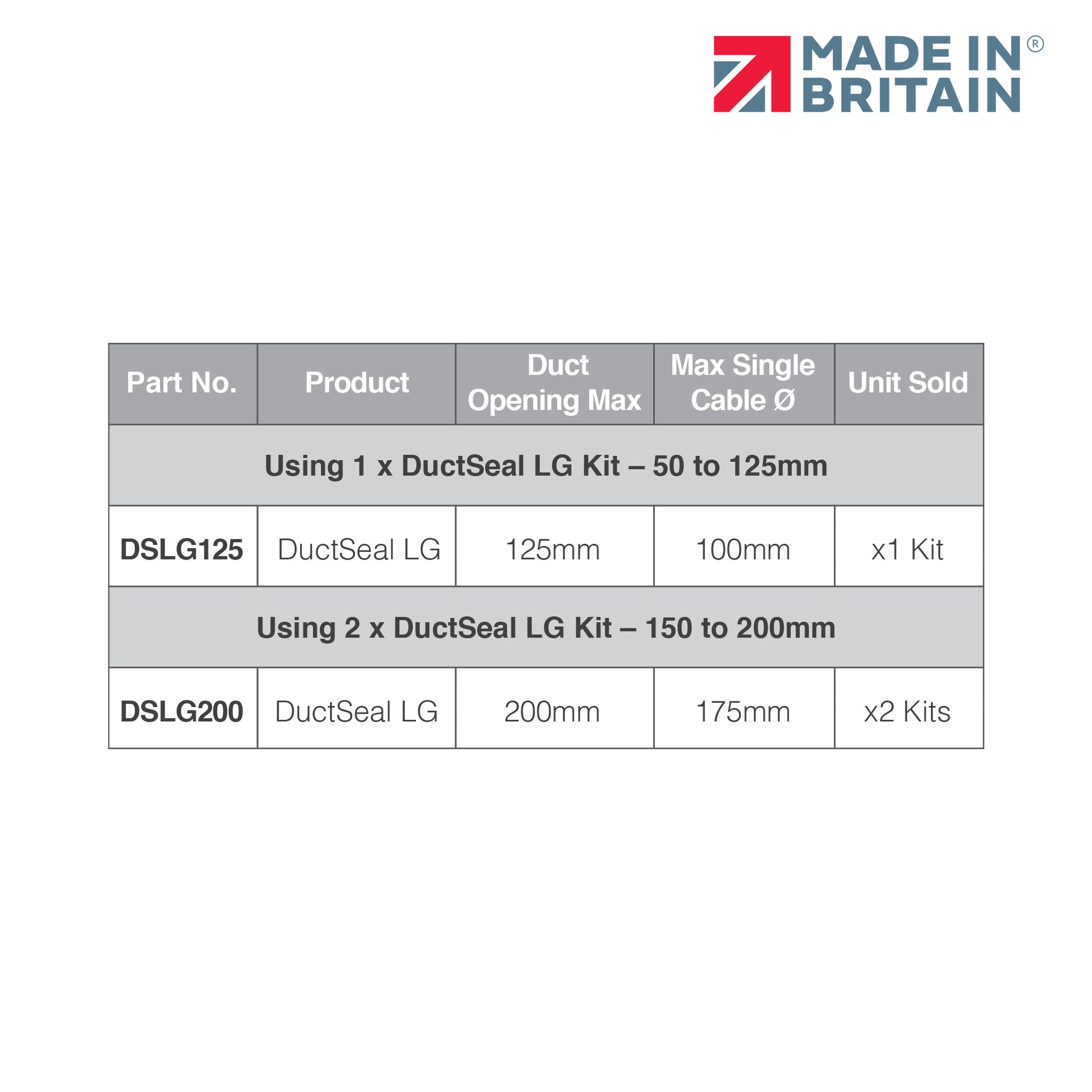 Each kit includes all components required to seal one duct, based on the kit size selected.